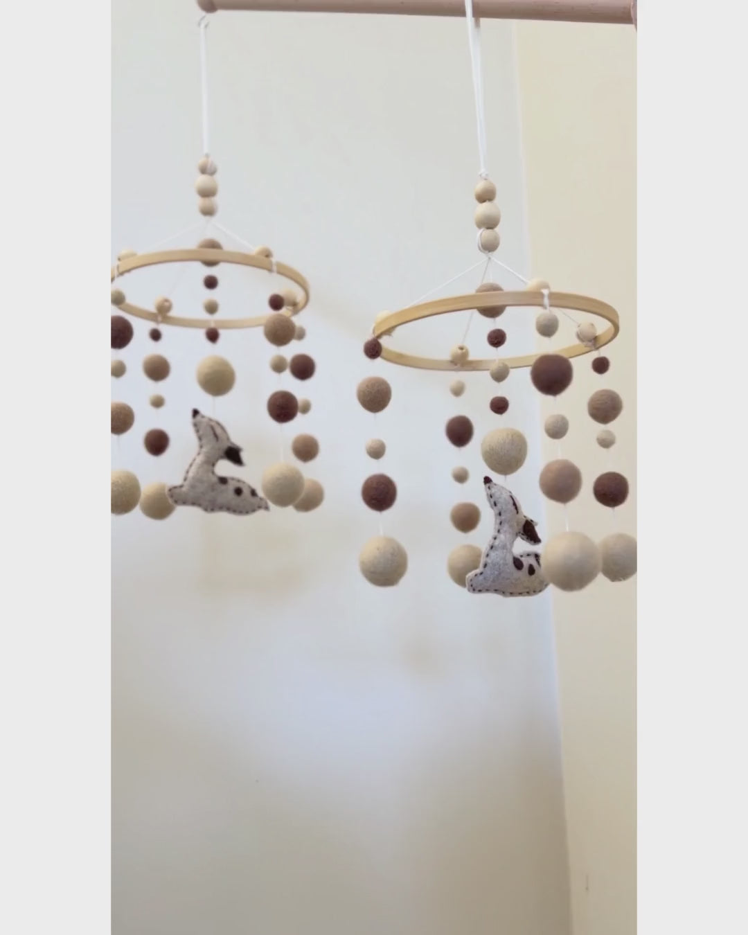 Handmade from 100% pure wool felt and wool stuffing, each fawn is stitched with care and suspended among wool felt balls in warm neutral shades, creating a timeless keepsake that soothes as it decorates.