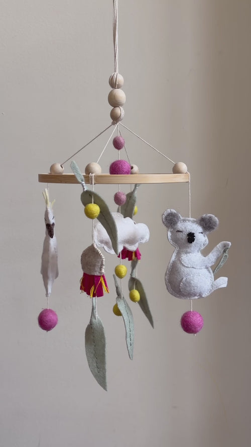 Remove gently from packaging and hang securely using the provided loop or your chosen ceiling hook. Felt elements may shift during transit and can be repositioned but should never be untied, as this will affect the mobile’s balance.